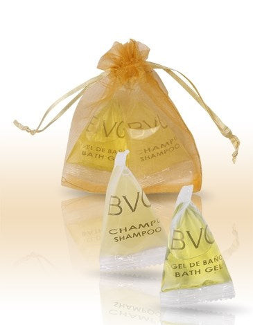2er Set Pyramiden-Sachets der Kollektion BVG Gold im Beutel, bestehend aus Shampoo und Duschgel 15ml