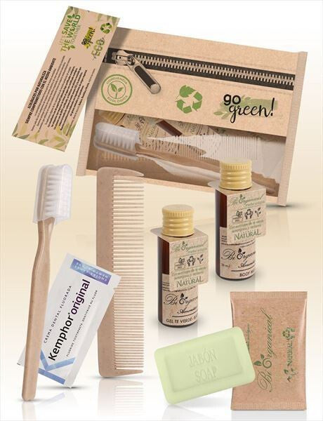 Échantillon Trousse de toilette bio à usage unique (avec fermeture éclair simulée), composée de: